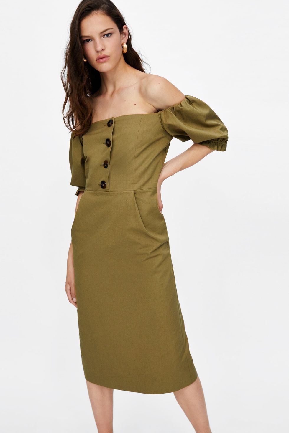 Zara Off-the-Shoulder Dress ($70): All the yeses to this versatile and very affordable frock. Paint the town olive in this smart and sexy smock without sacrificing comfort.