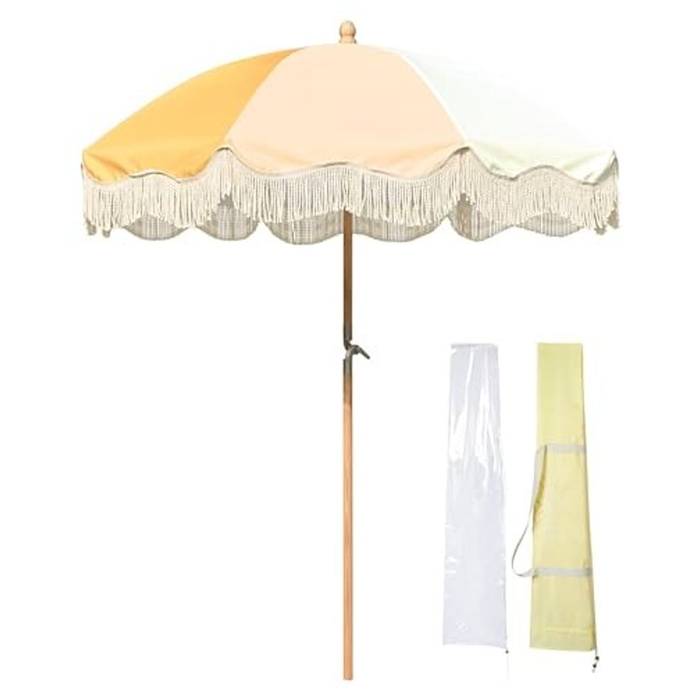 The Palm Springs style umbrella brings a splash of golden daffodils to your outdoor spaces. Its nostalgic cotton fringes harken back to the fabulous 1950s. More than just a source of shade, this umbrella serves as a stylish nod to a classic era.