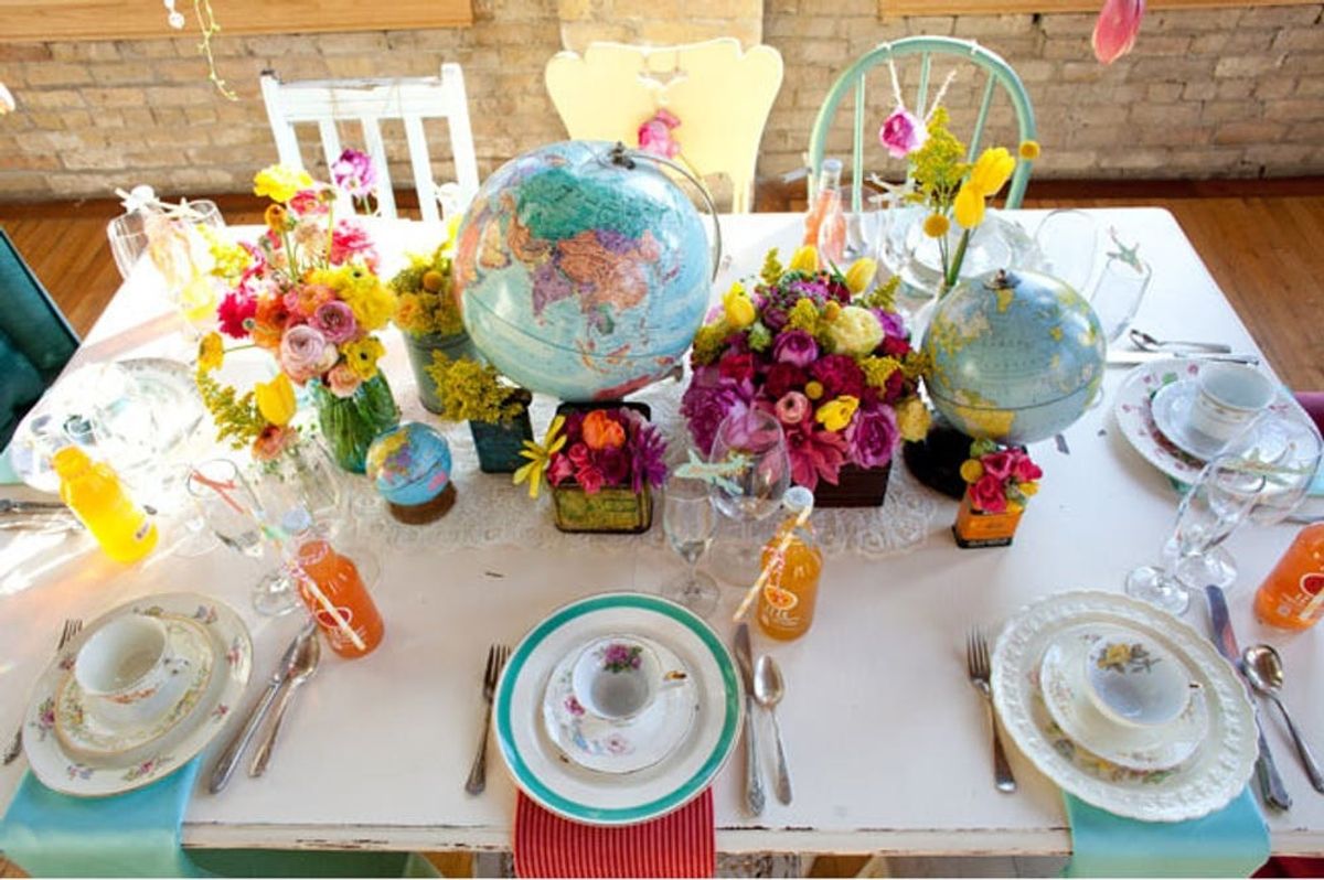 1. Global Centerpieces: Using globes as centerpieces along with some vintage books and simple name tags is an easy and elegant way to show your guests that you’re about to embark on the best honeymoon ever. (via Every Last Detail)