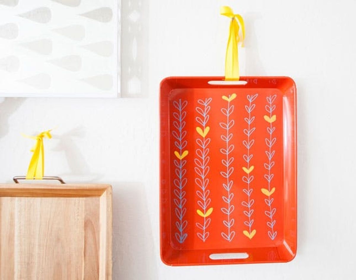To turn these trays into wall art, simply tie ribbon around the handle and hang. If your tray tilts off the wall, use sticky tack on the bottom edge to keep level against the wall.
