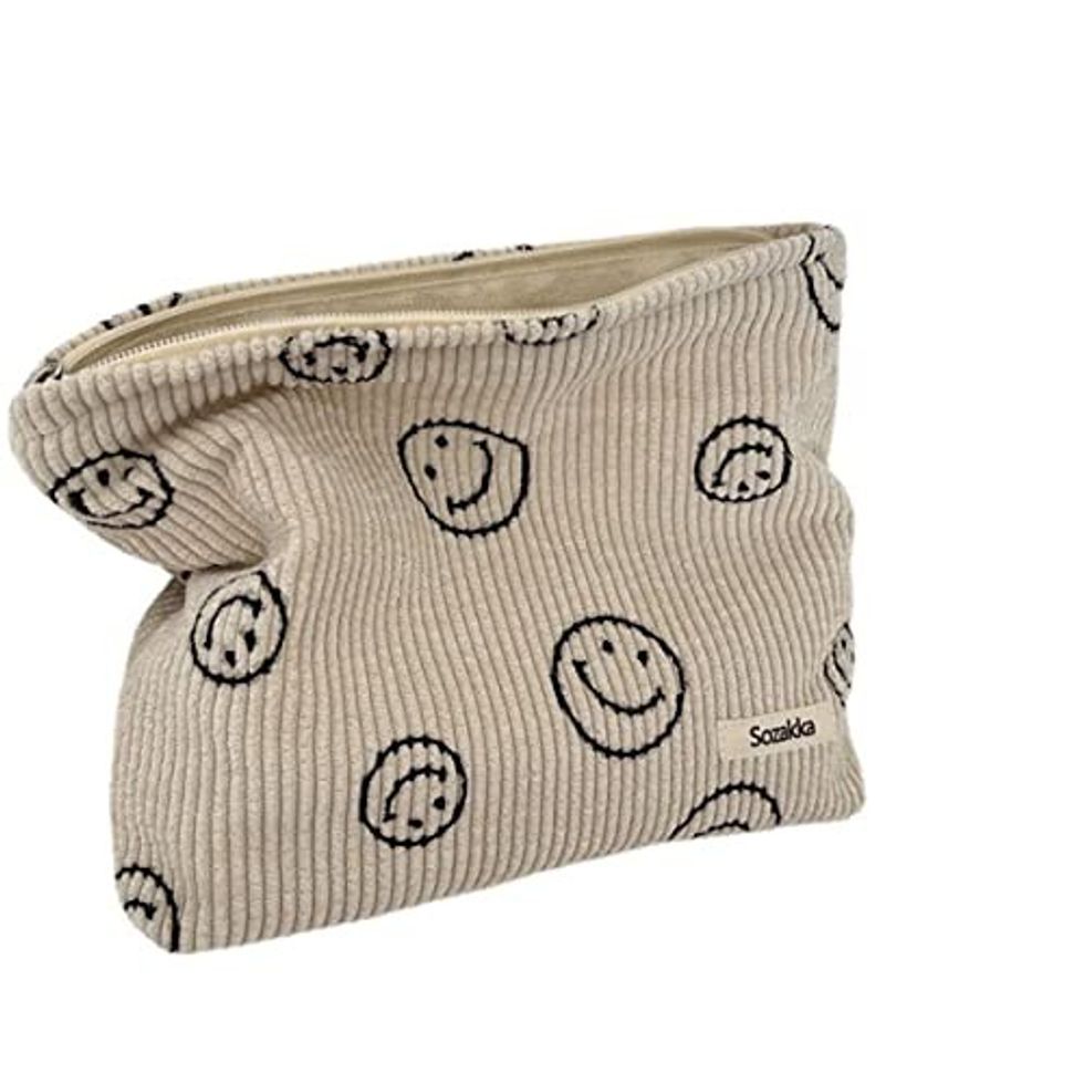 This Corduroy Cosmetic Bag is your only makeup accessory in 2023. It helps you stay organized and carry all your beauty essentials with you on the go. Made from soft and durable corduroy fabric, this cosmetic bag features a cute smile design and has plenty of room to store all your makeup, skincare, and other beauty items. The compact size makes it easy to tuck into a handbag or suitcase.