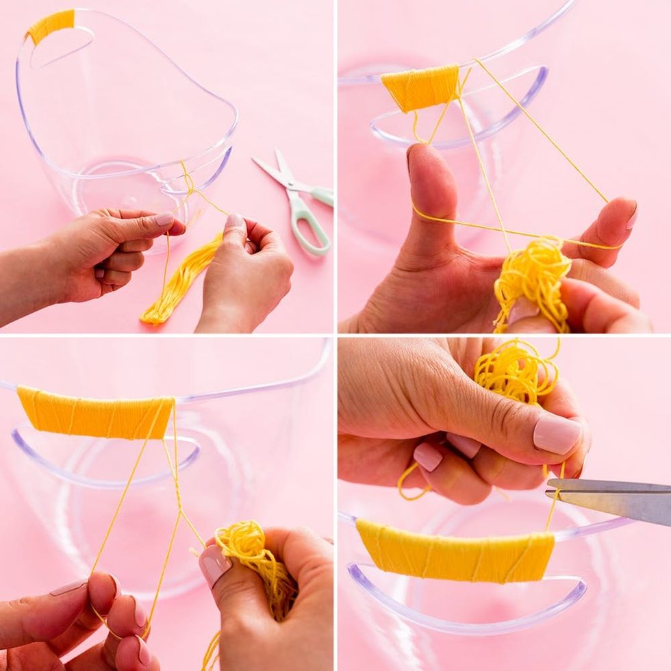 First up, add a pop of color to this ice bucket by wrapping the handles with embroidery floss. It’s time to tap back into that childhood knowledge of friendship-bracelet making for this one. Tie a loop around one end of the handle, and then, use a series of forward knots to create a seam that wraps around the handle. Once you’ve made it across the handle, tie the string off and cut.