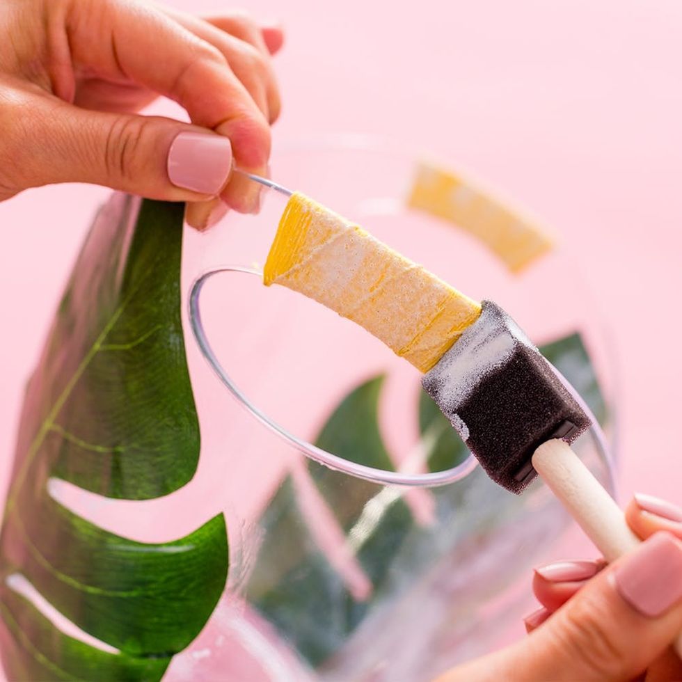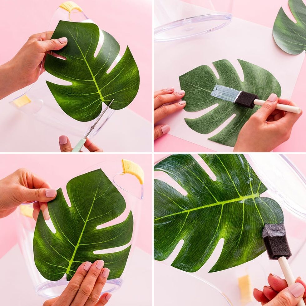 Next up, add your tropical flair with these palm leaves. Position your leaf where you want it and cut off any access. Adhere to the ice bucket with your glue and sealer using one coat directly on the back side of the leaf. And then, apply another thin layer over the leaf once it’s on the ice bucket.