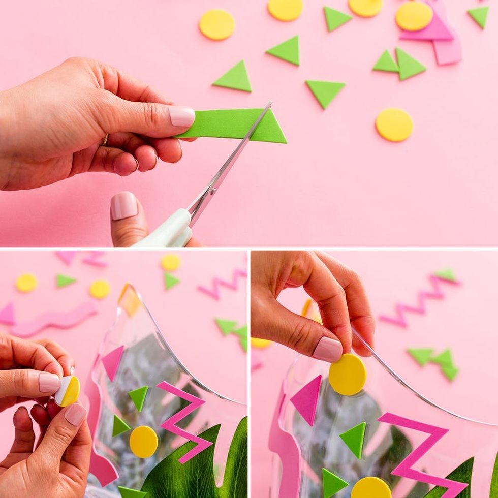 Lastly, you’ll want to add A LOT of colorful flavor. Cut out your foam adhesive sheets into different, energetic shapes and sizes. Get creative on your layout for a totally original masterpiece.