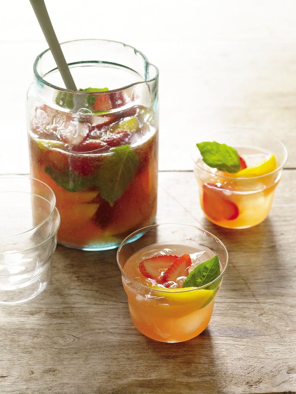 - Add the basil, sparkling water, vodka, rosé, and the remaining 1 cup strawberries and 1/2 cup mango to the pitcher. Stir to combine. Chill for 30 minutes or up to 2 hours. Serve over ice.