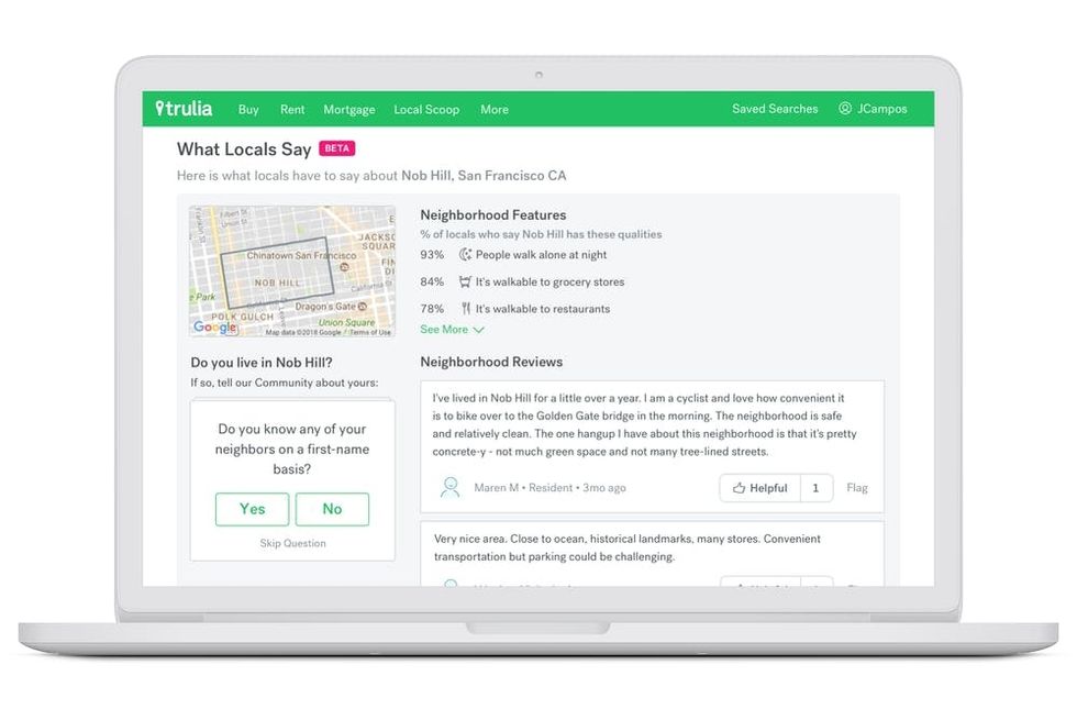 Trulia just launched a new feature called “What Locals Say,” and it’s pretty much what it sounds like. Basically, current neighborhood residents can answer questions regarding its vibe — ranging from the restaurant scene, whether it’s dog-friendly, and whether it feels safe to walk around alone at night. (For instance, 95 percent of Civic Center, San Francisco residents polled say the area is dog-friendly.) That way, prospective renters and buyers can get a feel for the lifestyle factor. Think of it kinda like Yelp for real estate.