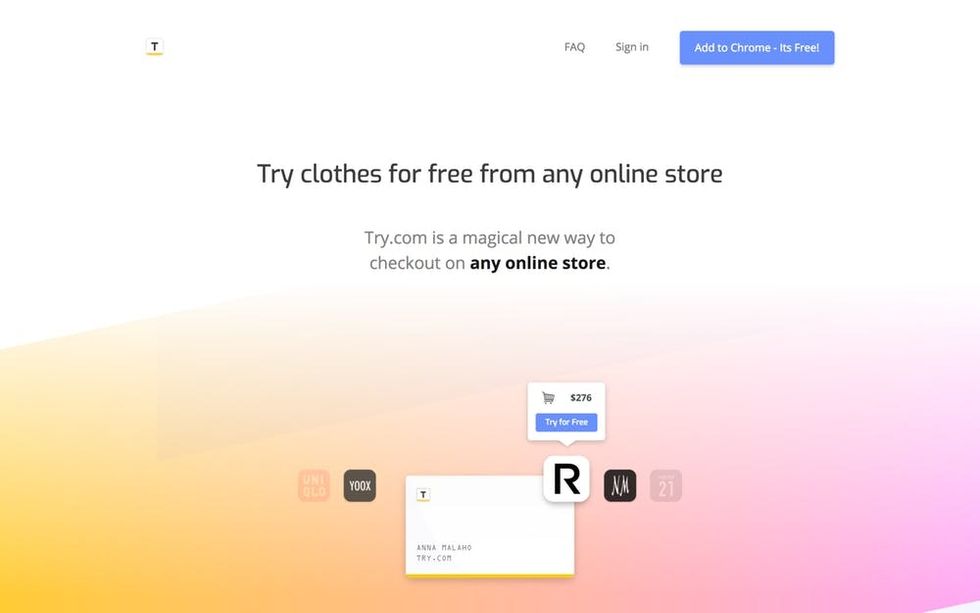 After that, you can shop as you normally would. When you go to click “add to cart,” simply click the blue “try for free” button instead (if the button doesn’t show up, you can do it manually by clicking the Try.com extension in your toolbar). You’ll have seven days to try the items and then return whatever you don’t want. Whatever you keep will get automatically deducted from the bank account you have on file with Try.com. No more paying for stuff you’re not even sure will fit; now you can just order a few sizes at once without needing all the cash upfront.