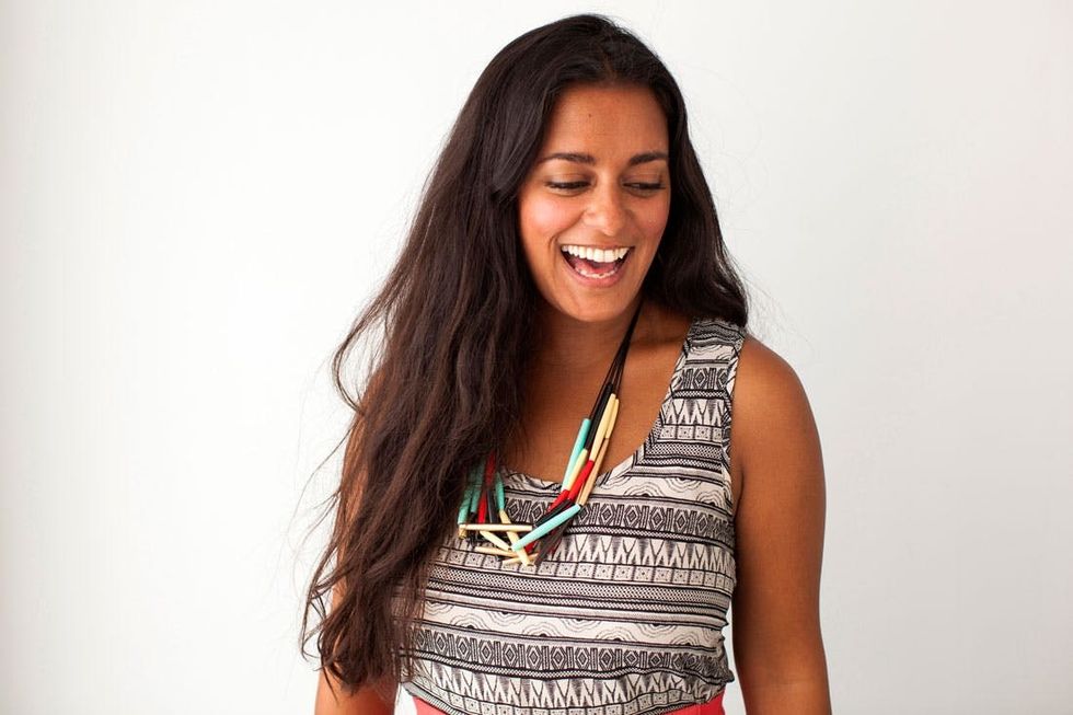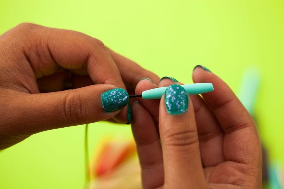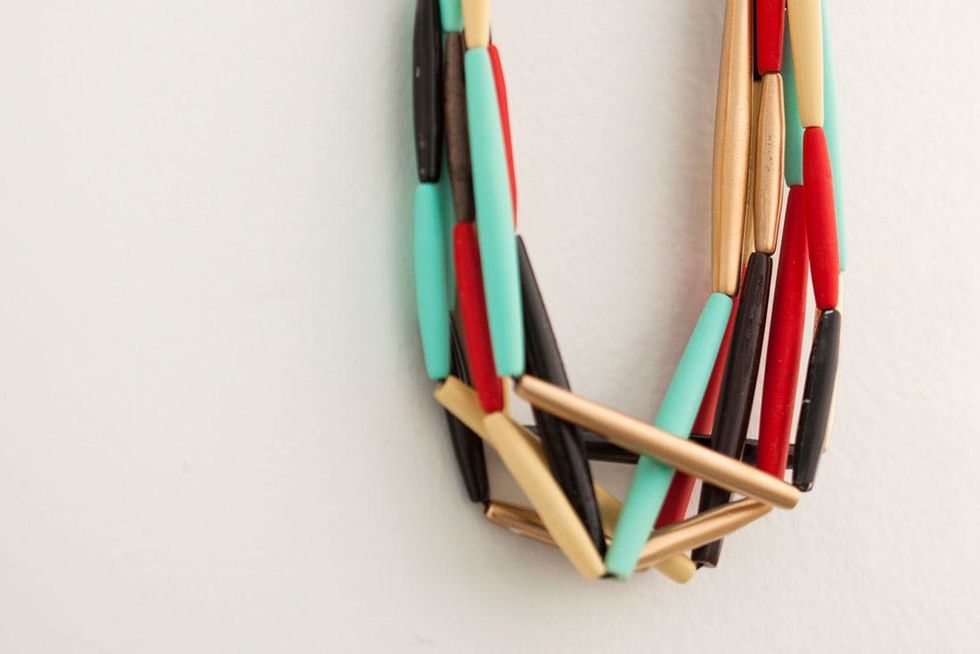We couldn’t find rectangular beads at our local bead store, so we went with long sort of oblong-shaped tube beads of different lengths. To keep things simple, we knotted all of the strands together at the top, eliminating the need for traditional jewelry tools or clasps.