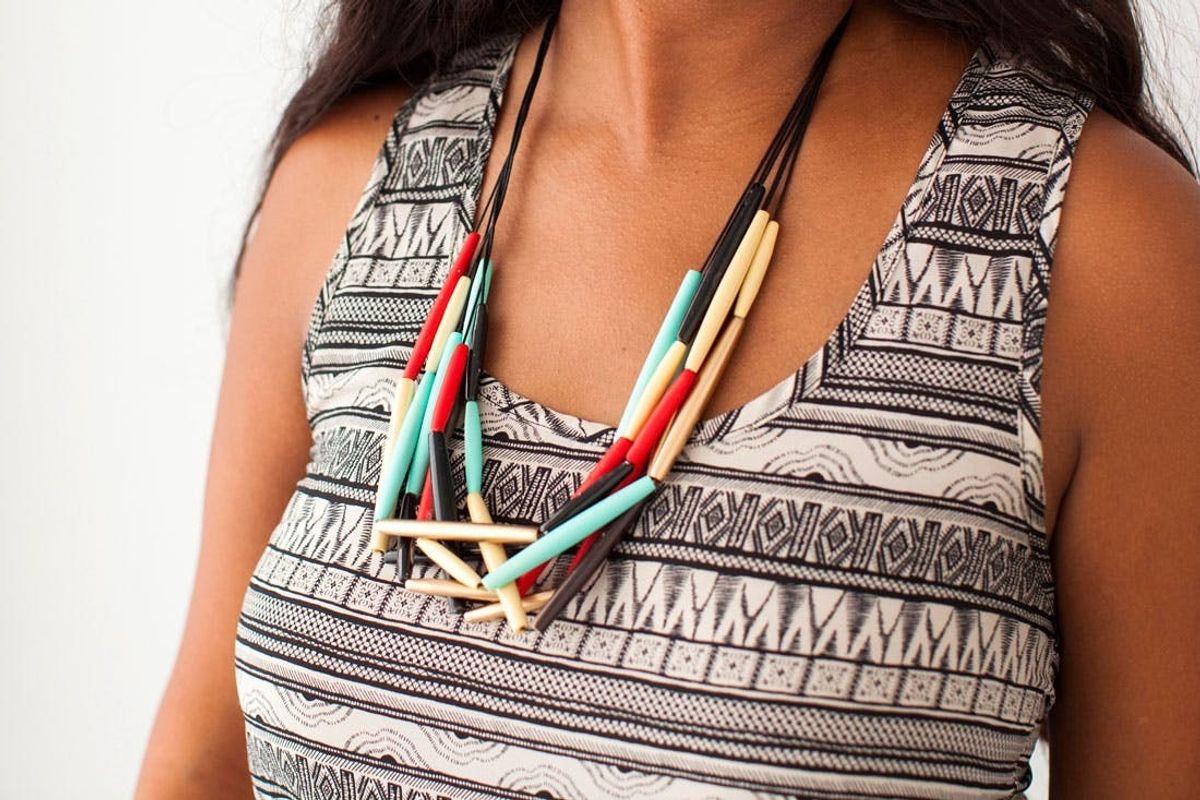 We couldn’t find rectangular beads at our local bead store, so we went with long sort of oblong-shaped tube beads of different lengths. To keep things simple, we knotted all of the strands together at the top, eliminating the need for traditional jewelry tools or clasps.