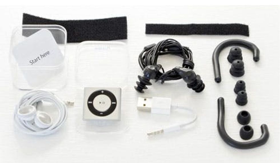 7. Waterfi Shuffle Swim Kit ($150): The Waterfi Shuffle Swim Kit is perfect for folks looking to get into some serious aqua fitness. It includes a waterproofed iPod shuffle, waterproof headphones, and a mounting kit allowing you to attach the waterfi to a headband, arm band, hat, helmet, etc.