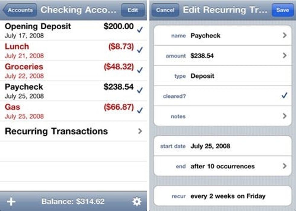 Balance: If you want a more bare bones approach to monitoring your cash-flow, try Balance. Functionally and visually, this app is similar to the paper checkbook register that accompanies all those boxes of checks you get every so often. The value in this is the idea that the exercise of manually entering in every expenditure will help you become more aware of where your money goes.