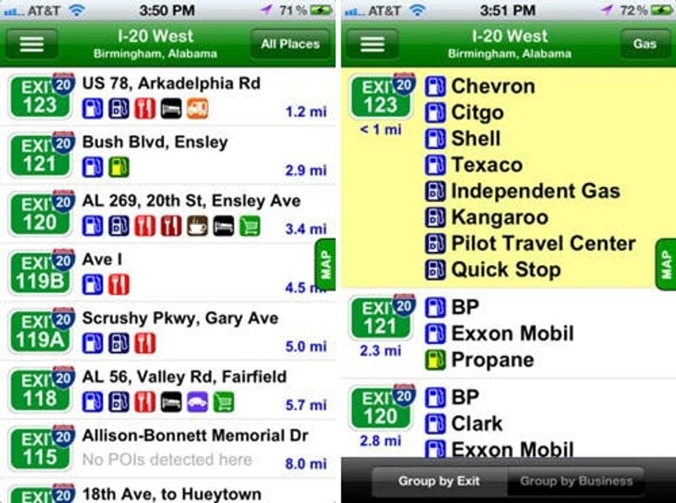 5. iExit ($0.99): How many times have you gotten off at an exit only to realize there are absolutely no restaurants nearby and only one gas station? If you're a road warrior, probably quite a few times. iExit tells you what's coming up in real time, and makes it easy to find the best exit for your needs.