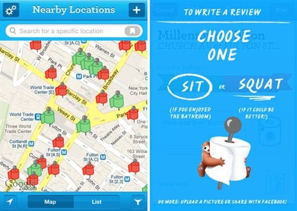 10. Sit Or Squat (Free): When you've gotta go, you've gotta go. Sit or Squat by Charmin is a location-based map of all the nearby public restrooms, with ratings based on reviews. Choose "Sit" if the bathroom is good, and "Squat" if it could be better.