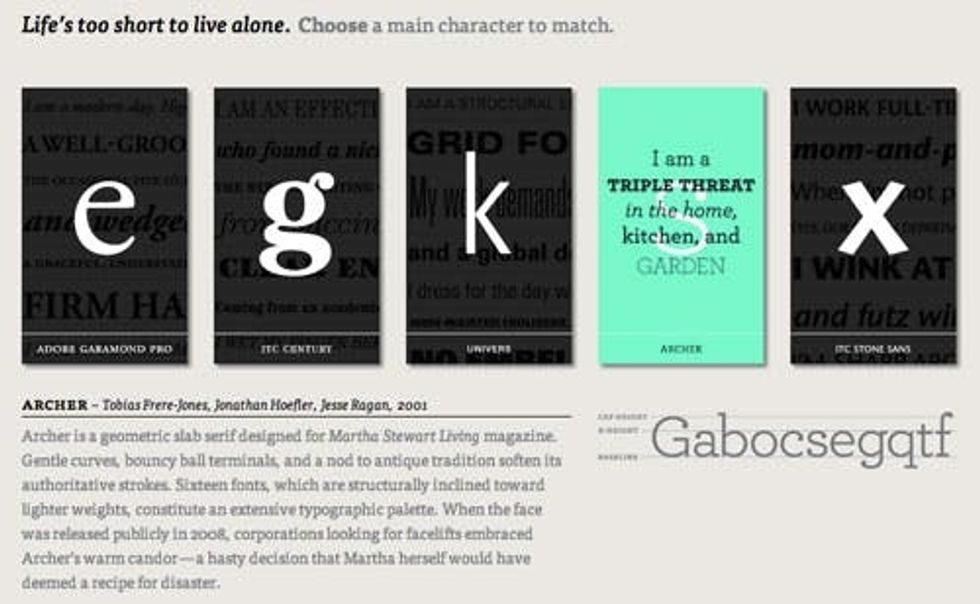 2. Type Connection: It's the Love Connection for type. This game helps you learn how to pair typefaces in the style of a dating website. It features well-known, workhorse typefaces and portrays each as a character searching for love. We were naturally drawn to Archer, a font designed specifically for Martha Stewart Living.