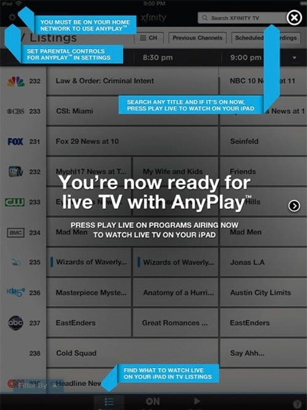 Comcast is in the midst of testing its new AnyPlay device, a gadget that will deliver your cable lineup wirelessly to any phone or tablet that has the Xfinity TV app installed and connected to your home's wireless network. This is huge. It essentially turns your iPad into a TV screen. Just add a Koala Mount on there, and you've got yourself a new 9" flat screen TV ready to watch on the wall at home.