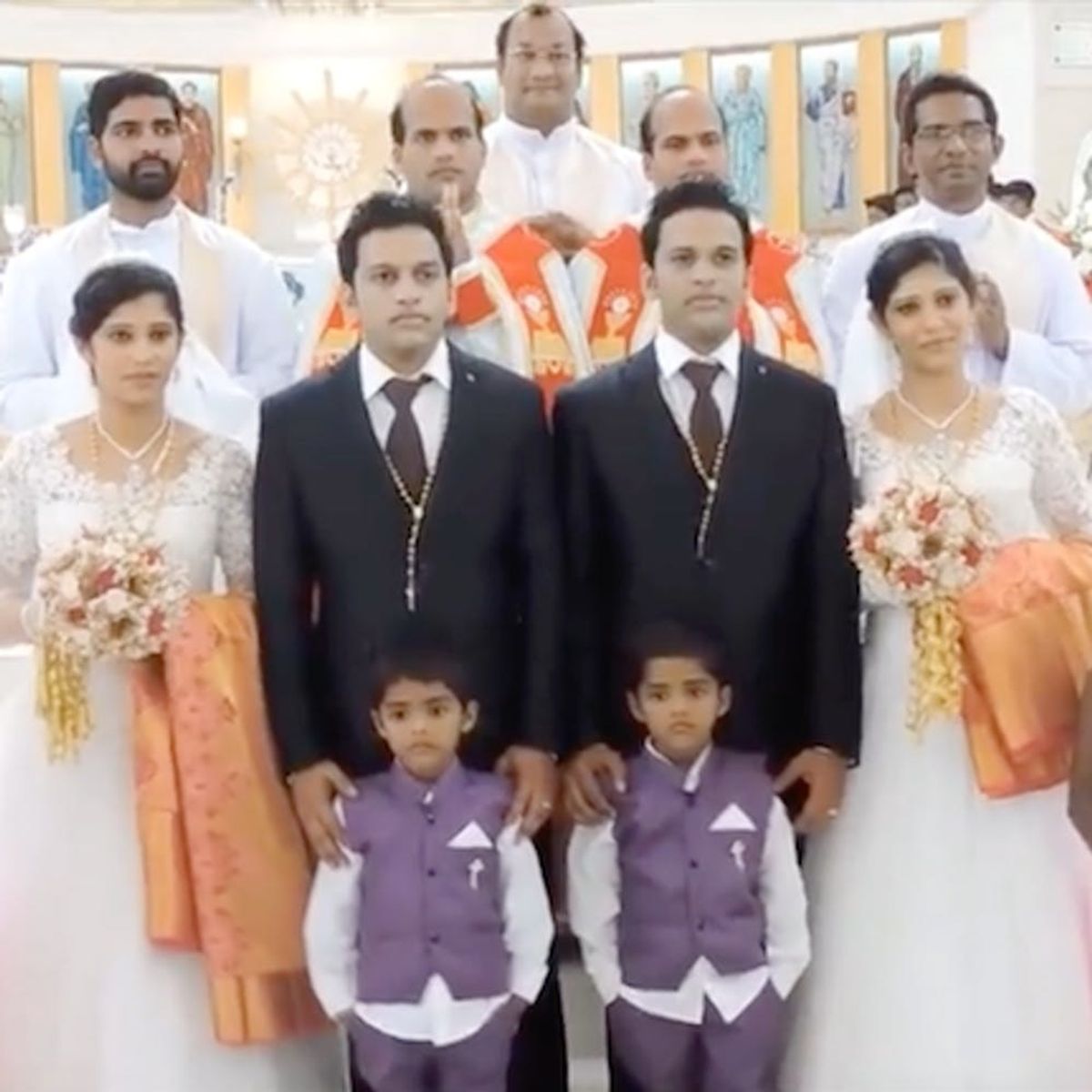 Recently, identical twin brothers Dilraj and Dilker wed identical twin sisters Reema and Reena in a much publicized wedding in the the town of Irinjalakuda in Kerala, India. I mean, it’s not the first time in history that twins have married other twins, but what makes this wedding so OMG is the fact that everyone in the wedding party (including the priests who officiated the wedding) were twins — and identical ones to boot! Seriously, this video will have you seeing double.