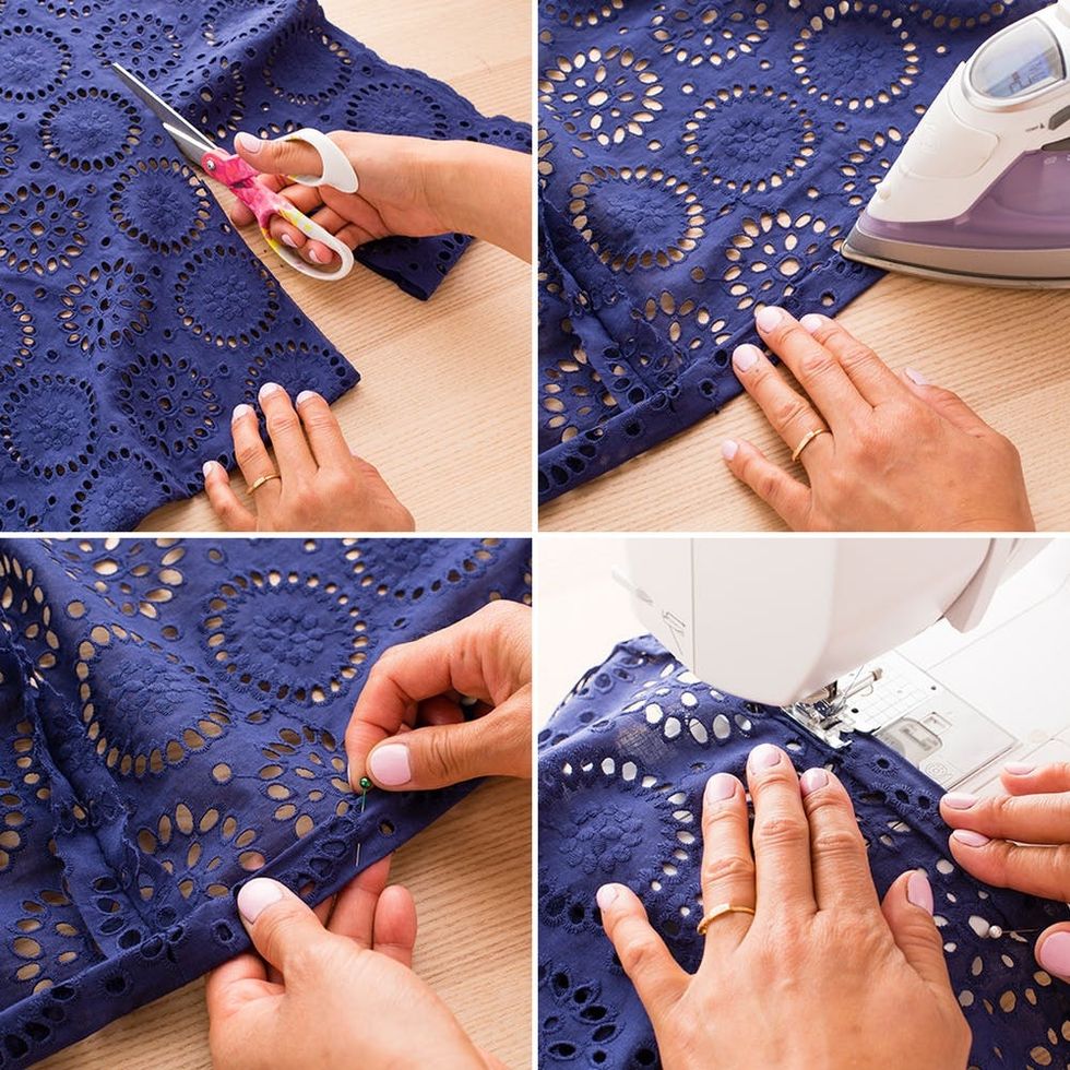 Take an old pair of shorts to the next level by adding some cute eyelet trim. Cut a piece that’s an inch longer than the circumference of the shorts leg. Create a seam at the top by folding over the edge and press. Pin to the edge of the shorts and sew.