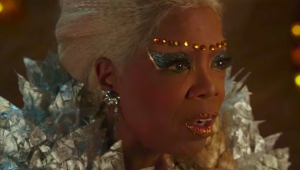 The two-minute teaser features Oprah as a bejeweled, blonde AF supernatural being (one Mrs. Which) with crimped (yes, crimped!) hair and dazzling makeup, helping a young 13-year-old math whiz named Meg Murray (played by Storm Reid), travel through space and time to save her father (Chris Pine) from an evil force.