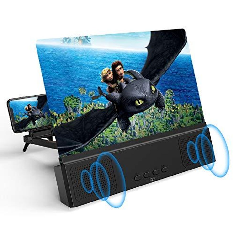 This 12" Phone Screen Magnifier is excellent for those who travel a lot because it provides a 3D HD projector screen to watch movies and play games on this foldable cell phone stand and has speakers.