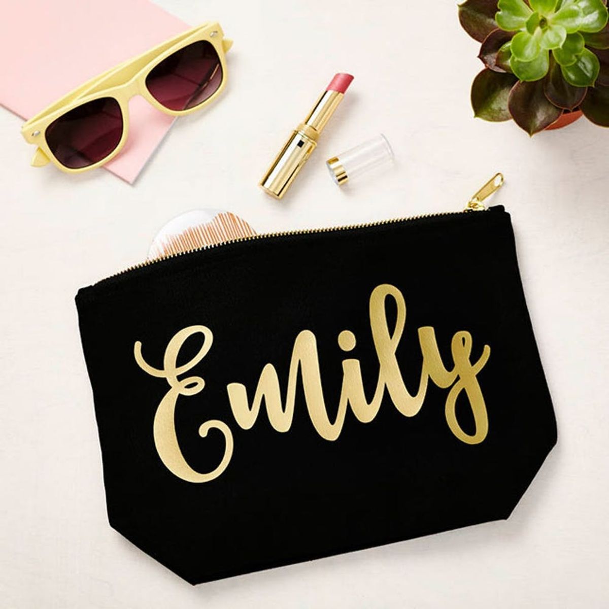 Beauty junkies will agree that you can never have enough makeup bags — especially one that’s personalized. If you really want to spoil them, throw in some lipstick for the big day.