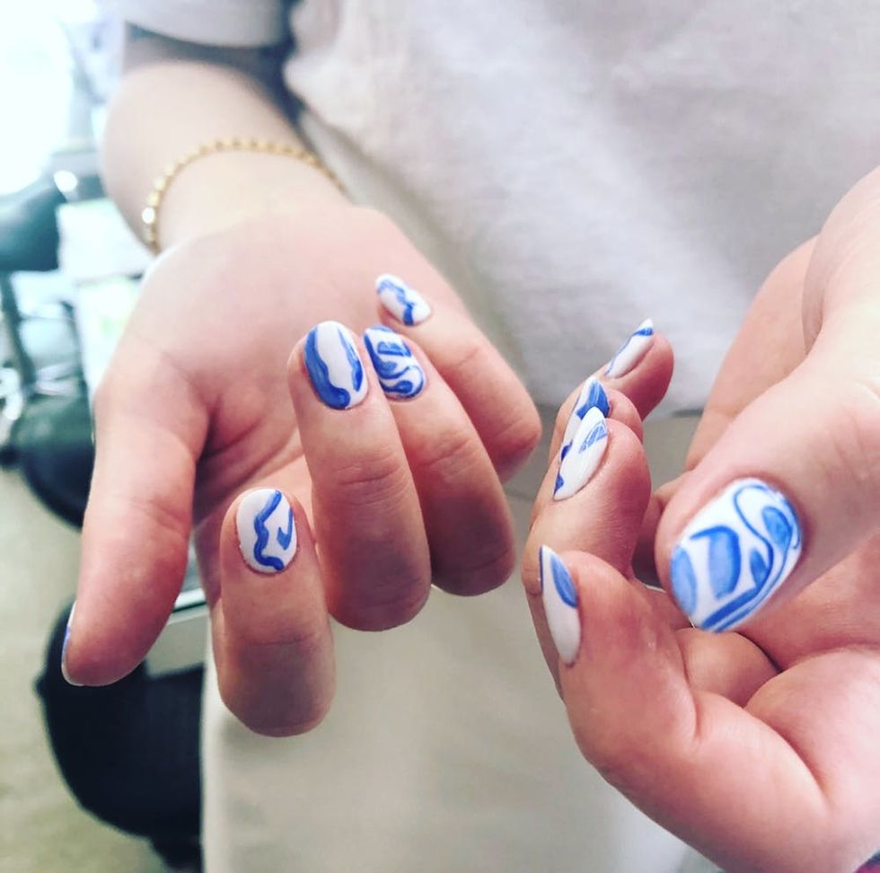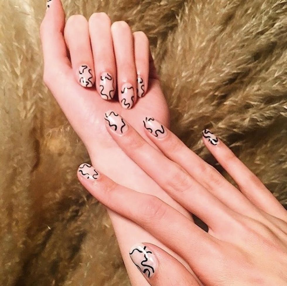 Achieving a Matisse manicure is as simple as a few squiggly lines and eye-catching color options. Before you get started, select two contrasting colors to elevate the design. Eda Levenson, the founder and creative director of Lady Fancy Nails, recommends a sheer base paired with a bold hue for a striking negative-space effect. Start with your base color, then go in with a fine brush to add the artwork. “From [the] lower corner edge of the nail, paint a squiggle that curves toward the top of the nail,” Levenson instructs. Repeat this step two or three times per nail, leaving space between each flowing line. Then, once the design is dry, go in with a high-gloss top coat. (Photo via Chillhouse)