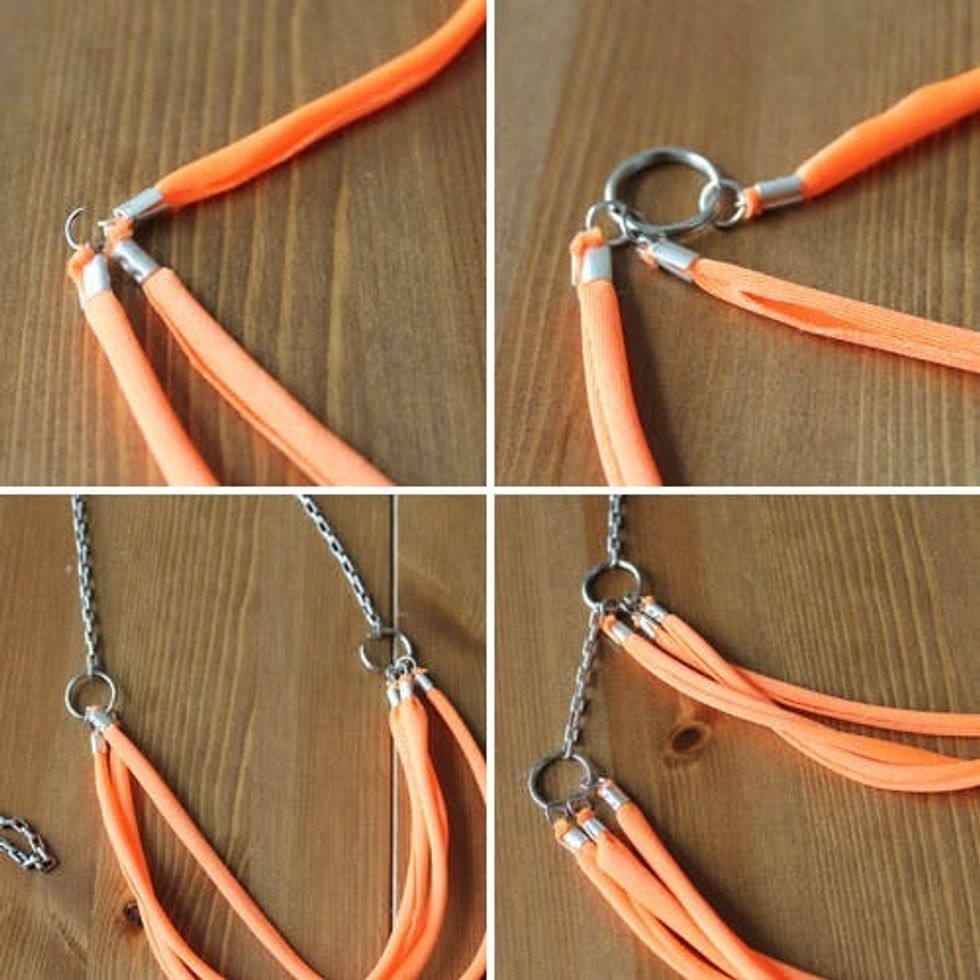 Attach each cord end to a loop, and then attach that loop to a small key ring. Now you've got your two necklace levels. Take the 8 inch section and attach both ends to a chain.