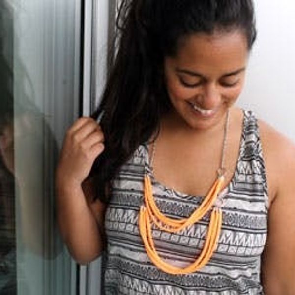 For our last necklace, we combined the orange with the peacock to bring an earthy tone to our love of neon.