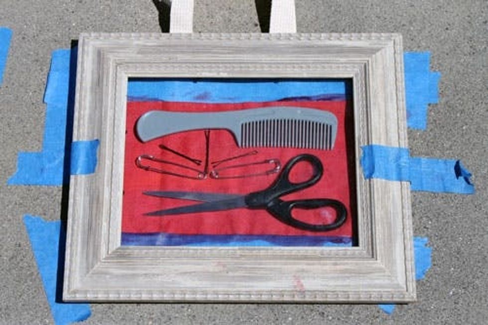Then we laid out our scissors, bobby pins, and comb with a piece of glass to hold it down.
