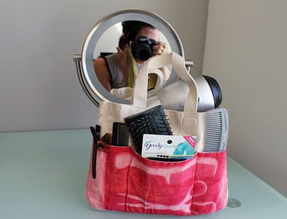 Next, we created a beauty tote for all of our style goodies. We taped off the pocketed section and painted it with red Inkodye.