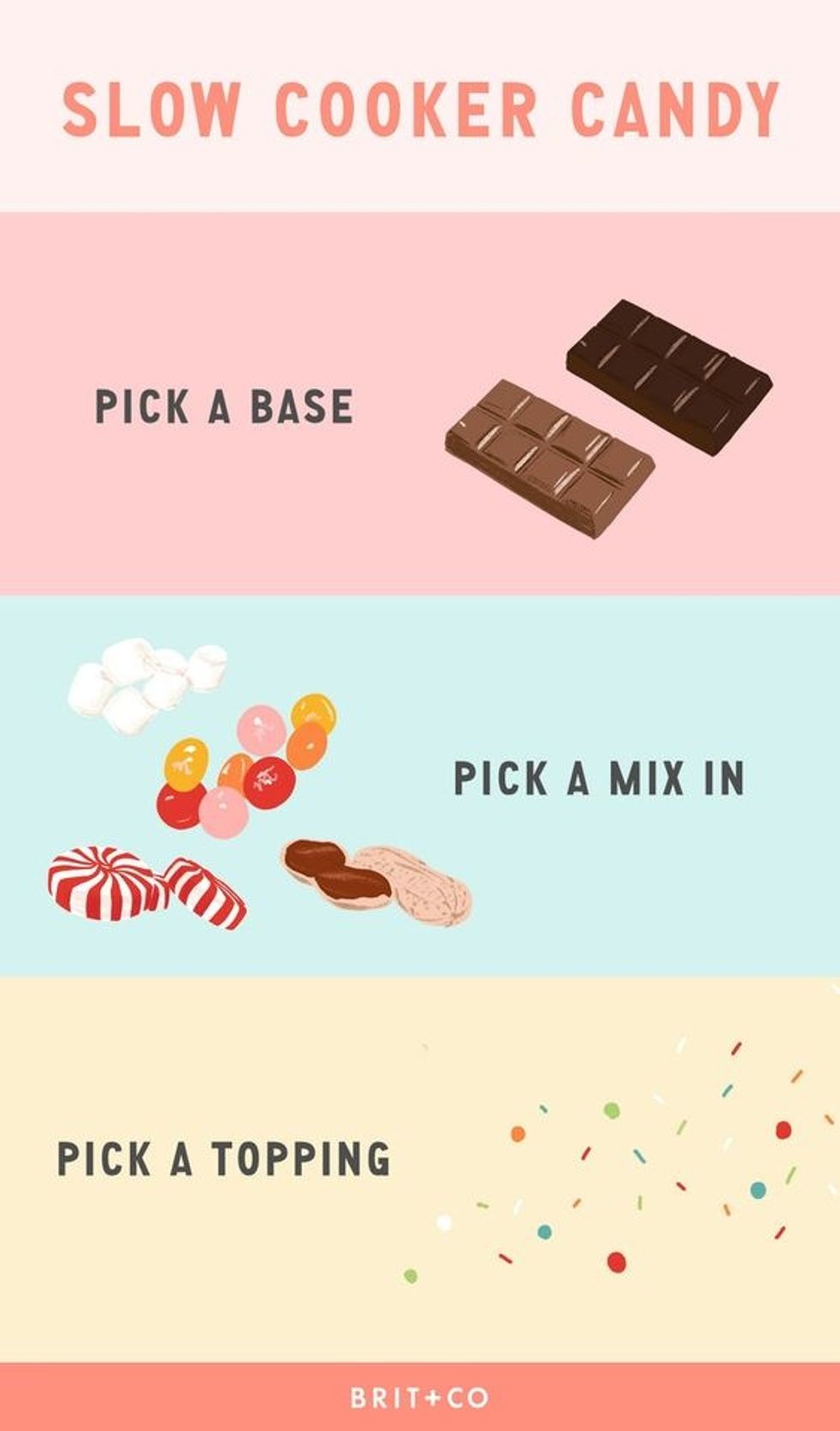 Prep the slow cooker for a sweet night in. Set up a candy bar of chocolate bars, hard candy and toppings like sprinkles and have kids make their own chocolate candy, slow cooker style!