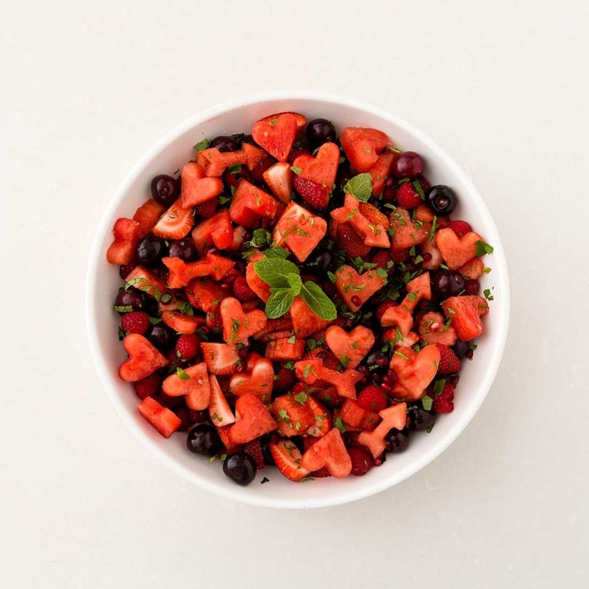 In a large bowl, combine cherries, pomegranate seeds, raspberries, sliced strawberries and the watermelon hearts and arrows. Top with chopped mint.