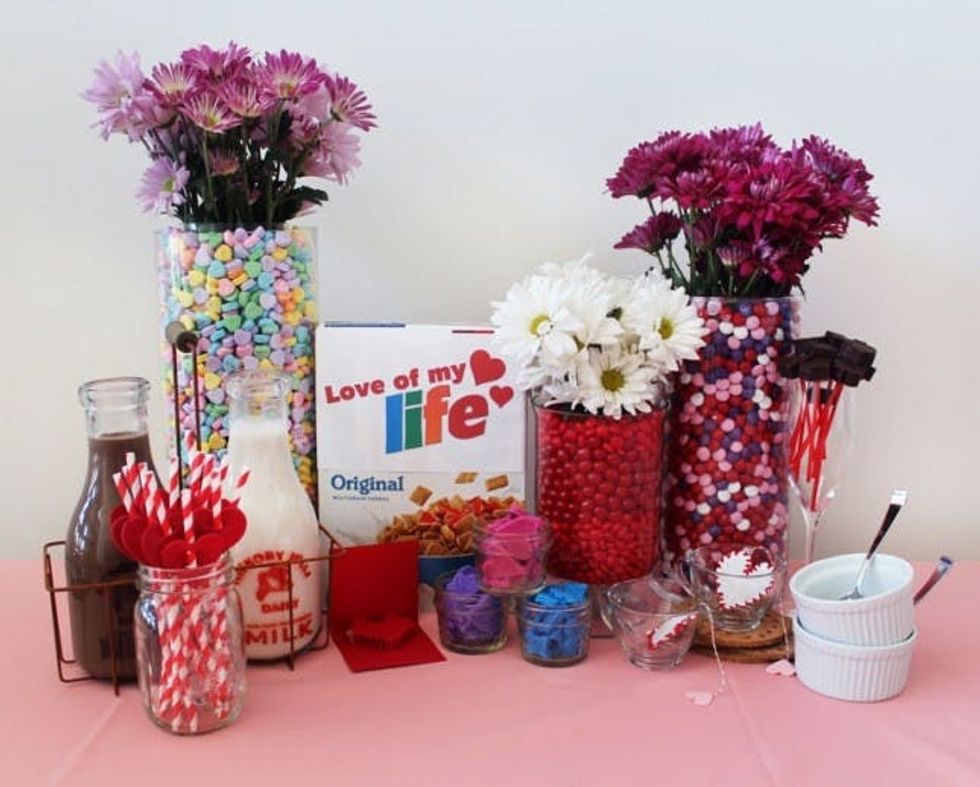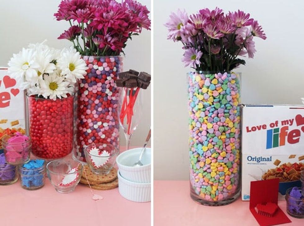 2. Candy Filled Vases: Can’t resist stocking up on bags and bags of Valentine’s candy but aren’t quite sure what to do with it? Or just looking to change up your tablescape? Put two vases together, fill with all your favorite heart-themed candies, and add flowers!
