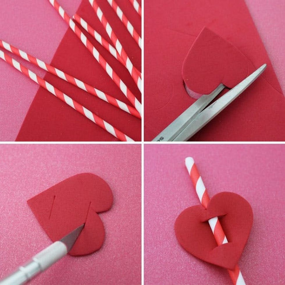 To create ours, we pressed a cookie cutter into foam, cut out the heart, then simply cut two slits to slide the straw through.