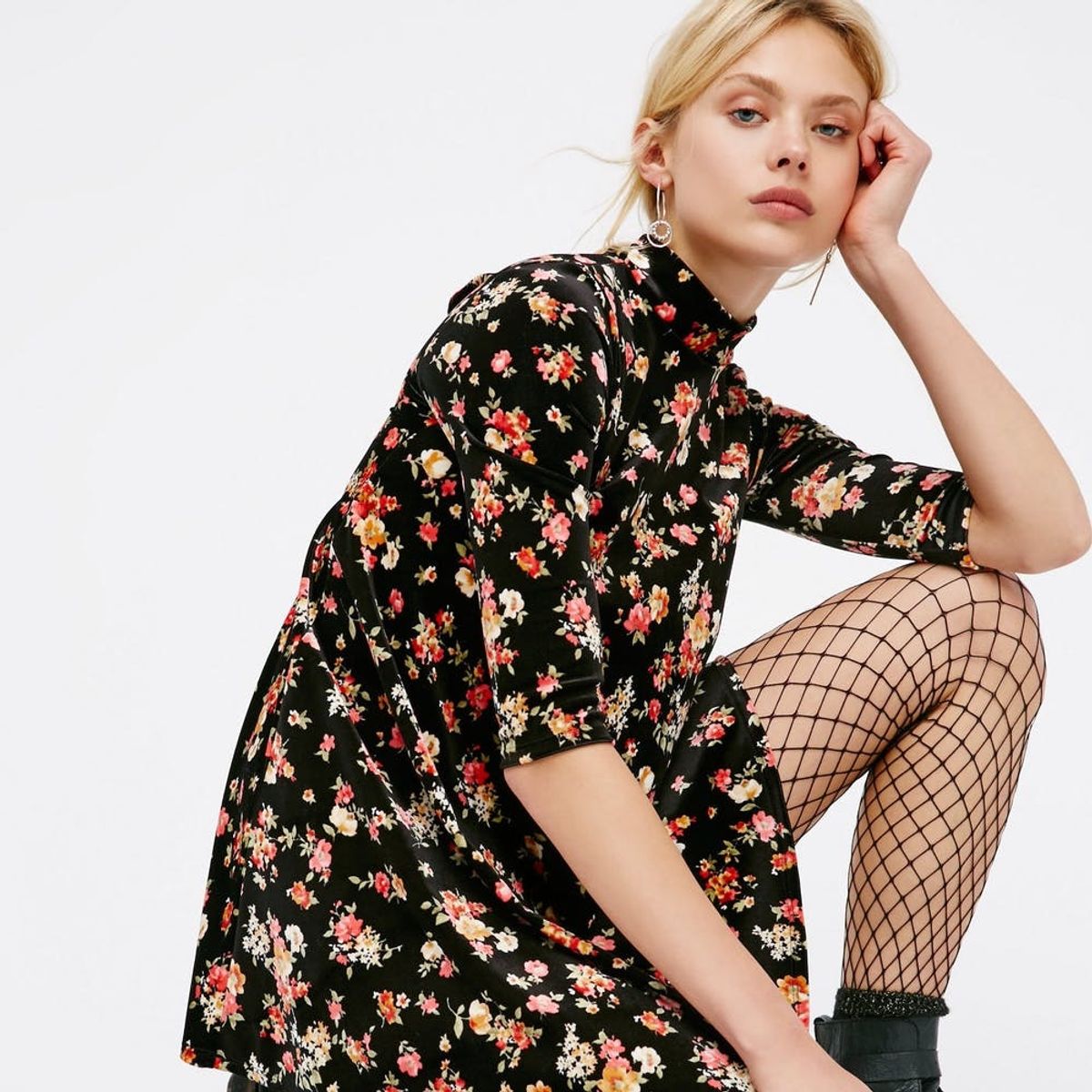 Found it. Take on the thrill of the weekend with this floral velvet mini dress that’s ready to mingle. Complement the swingy silhouette with a leather jacket, intricate lace tights and heavy-duty stompers for no shortage of style cred this season.