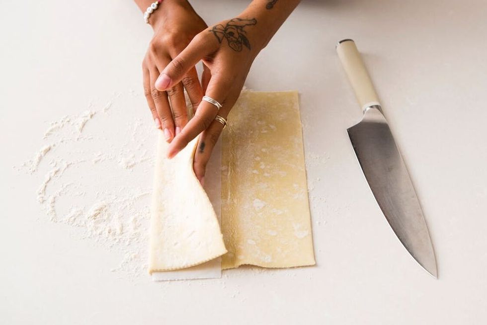 8. Fold the unfilled half of the pastry over the filled half, and press the edges with your fingertips to ensure each side is sealed. Repeat with remaining puff pastry.