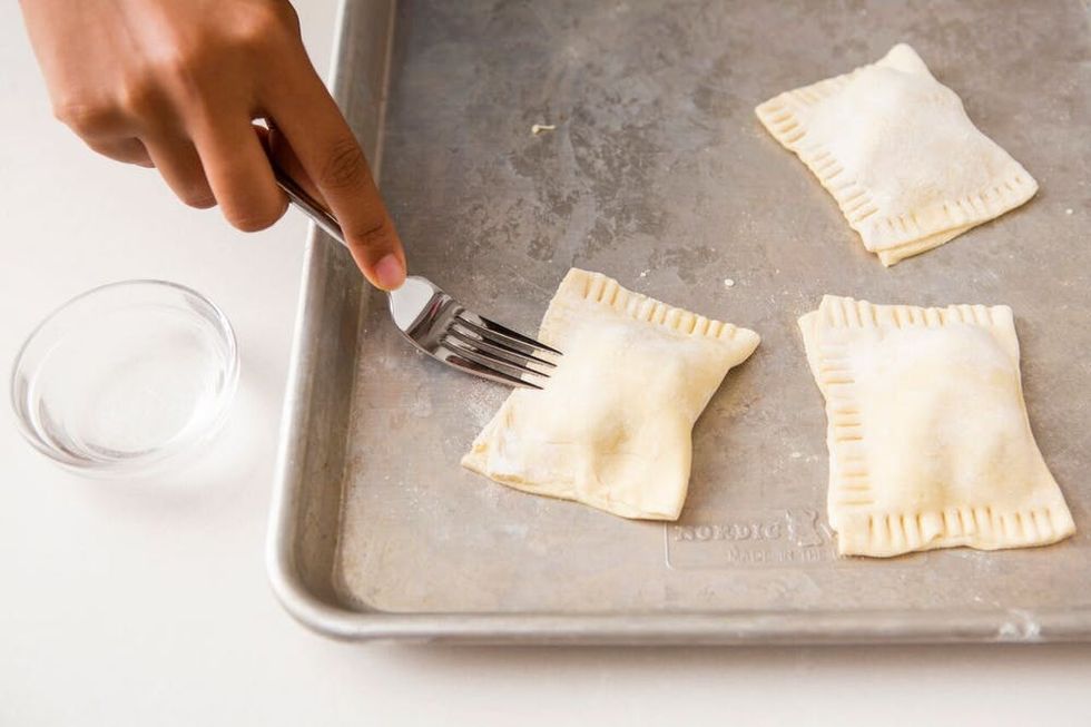 9. Use a fork and lightly press around the sides of your sealed pastry to add a decorative, crimped edge. Use a fork to prick the tops too, which will allow steam to escape as these bake to prevent them from bursting open.