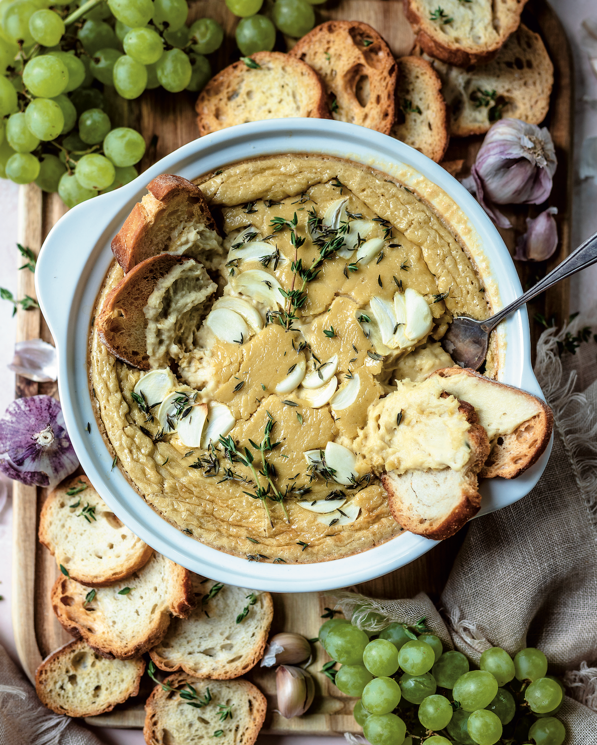 This baked brie is rich, creamy, and garlicky. I love serving this luxurious cheese when entertaining in the cold winter months to soothe the soul. Tuck into this warming dish with fresh baguette or crackers and a glass of red wine.