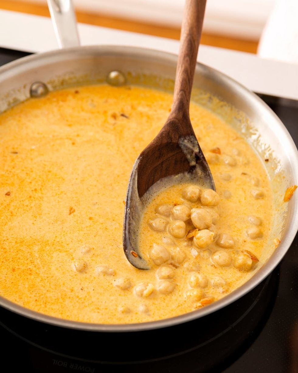 3. Add the coconut milk and chickpeas; let mixture come to boil, then reduce heat to a simmer for about 5 minutes. Season with lime zest, lime juice, and salt and pepper, to taste.