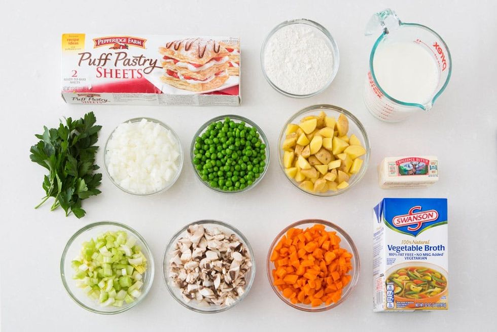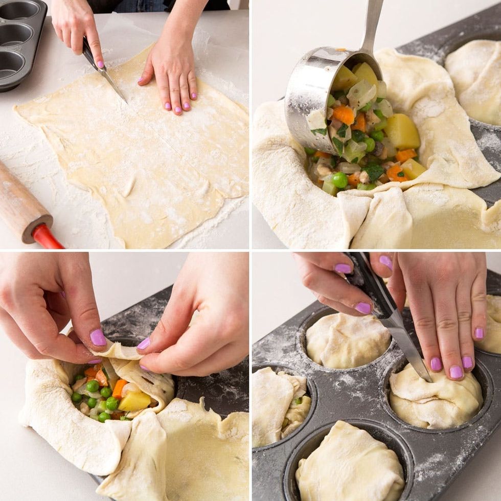 Lightly flour your work surface, and gently unfold one puff pastry sheet. Roll out the dough into a 15 by 15 inch square. Cut into 6 squares. Place one square in each of the muffin pan cups. Spoon the pot pie filling into the muffin pan cups. Gently fold the puff pastry over the filling. Brush each pot pie with the egg wash and bake for 25 minutes, until golden.