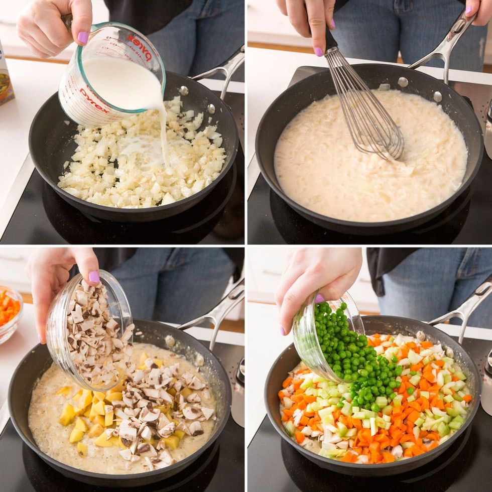 Heat a large skillet over medium heat. Add butter to the pan. Add the onions and cook 10 minutes, stirring occasionally. Add the flour. Whisk. Slowly whisk in the milk and vegetable broth. Add the celery, carrots, potatoes, mushrooms and peas.