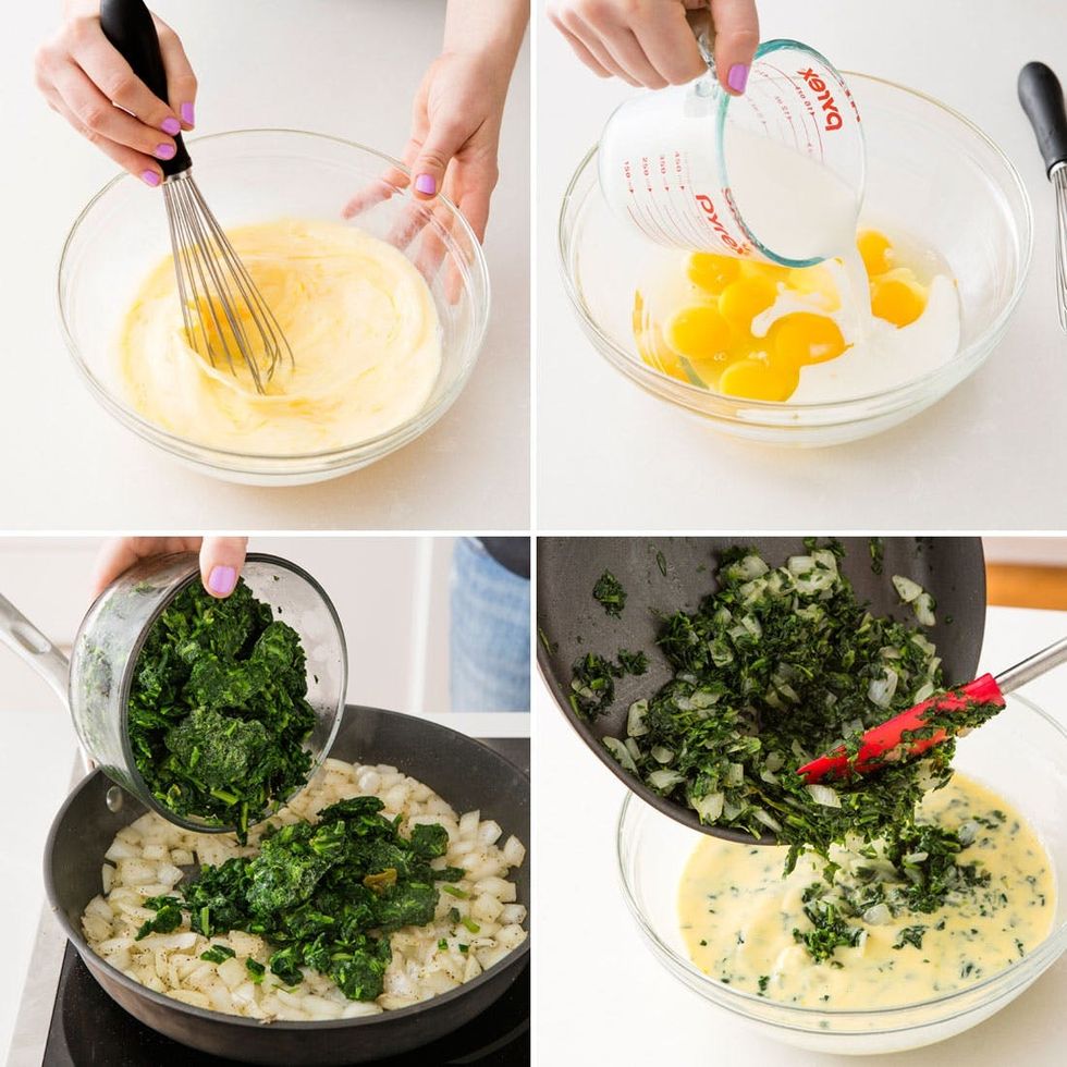 In a large bowl, whisk together the eggs and milk. Fold in the spinach mixture.