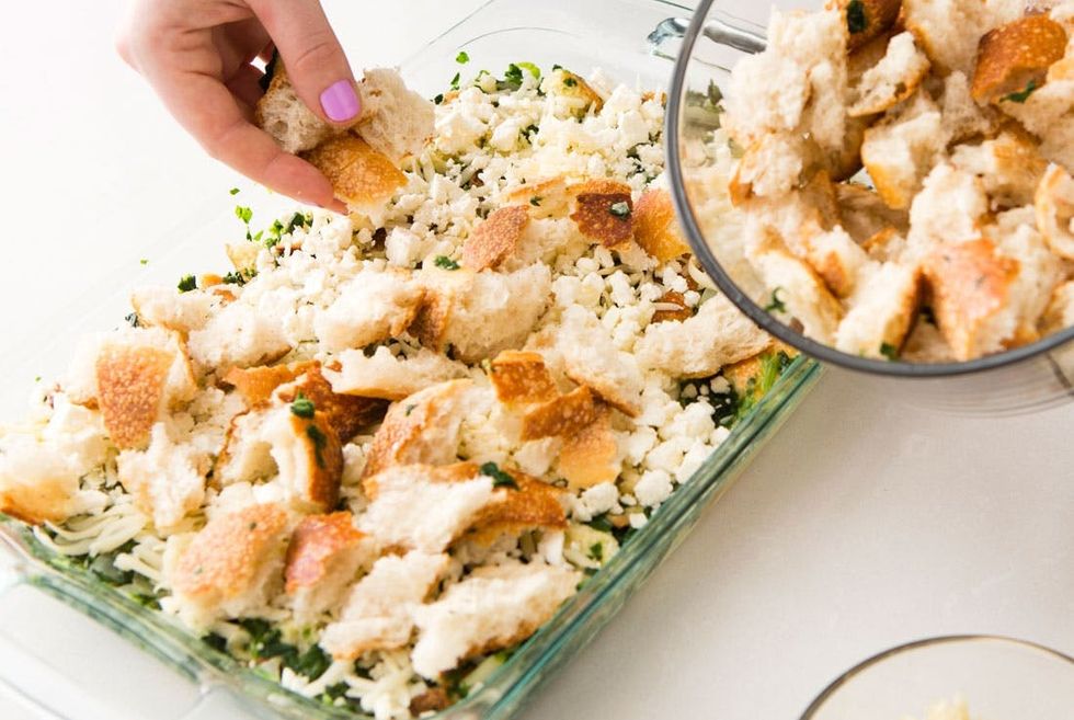 Place half of the bread into a 13×9-inch baking dish. Top with spinach mixture. Sprinkle with 1/2 cup swiss cheese and 1 cup feta cheese.