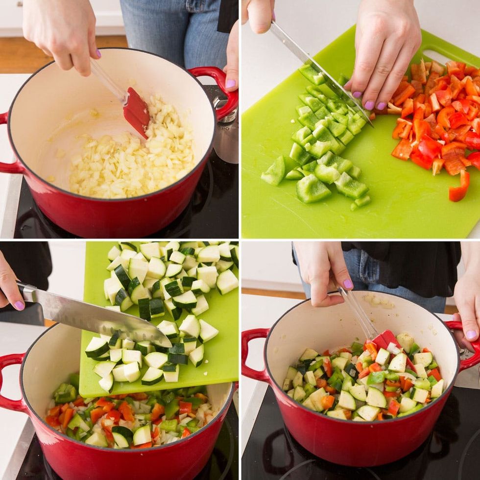 Heat a Dutch oven over medium heat. Add oil to the pan. Add onion and garlic. Cook 10 minutes, stirring occasionally. Add chopped green bell pepper, red bell pepper and zucchini.