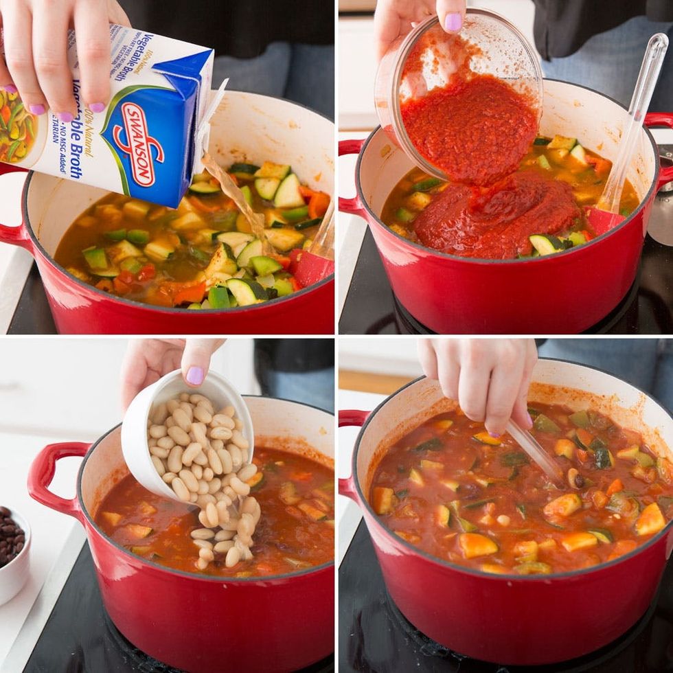Add vegetable broth and tomatoes. Bring to a simmer. Cook 30 minutes, stirring occasionally. Add beans. Simmer 20 minutes, stirring occasionally.