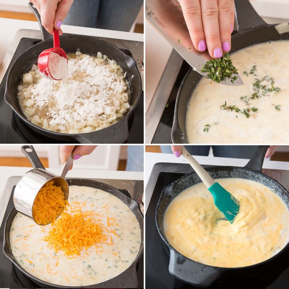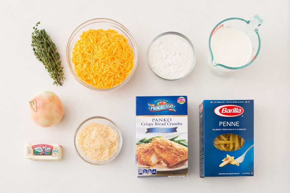 Preheat oven to 375 degrees F. Cook pasta al dente. Heat a large skillet over medium heat. Add butter to the pan. Add the onions and cook 10 minutes, stirring occasionally. Add the flour. Whisk. Slowly whisk in the milk. Add thyme, salt and pepper. Cook 5 minutes. Add cheddar cheese. Whisk until melted.