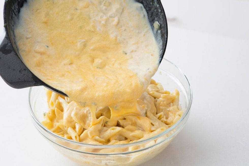 Pour cheese mixture over the pasta. Coat evenly.