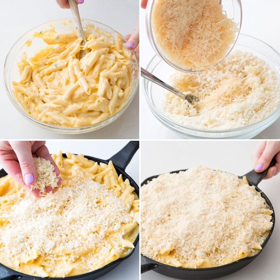 Pour mac and cheese back into the skillet. In a small bowl, combine the panko bread crumbs and Parmesan. Sprinkle over pasta. Bake for 30-35 minutes, until golden brown.