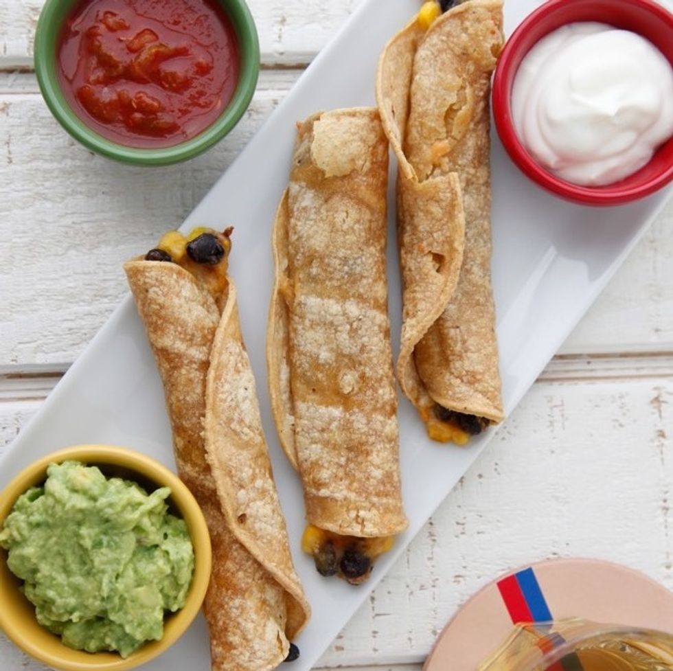 Serve this healthy take on taquitos — baked and stuffed with seasoned black beans, corn and cheese — with a side of guac, salsa and sour cream for a light lunch or hearty snack. (via Weelicious)