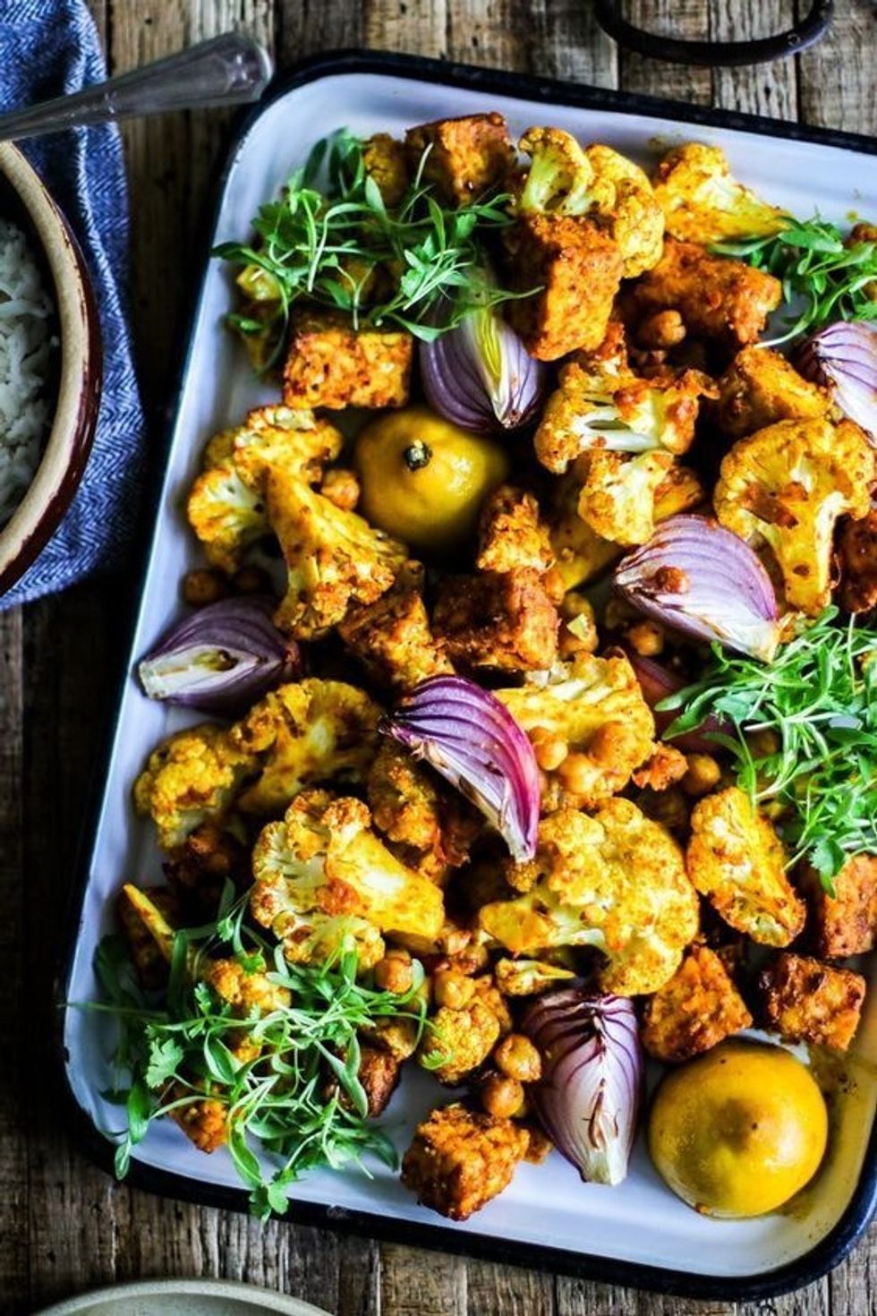 This colorful vegan and vegetarian version of shawarma is made right on a sheet pan! The cauliflower and tempeh are roasted with Middle Eastern spices like cumin, coriander, cinnamon, paprika, turmeric, and aleppo pepper, then spritzed with roasted lemon. Serve with pita bread! via This Mess is Ours