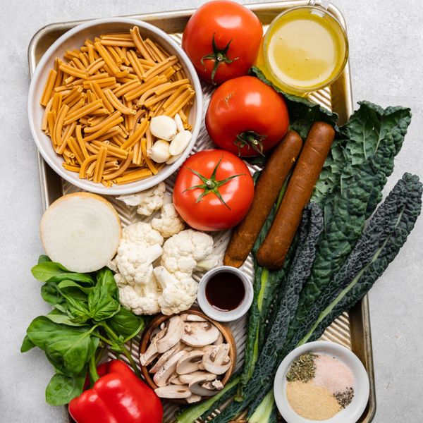 Last but not least...sheet pan pasta? Yes, you actually have to cook the pasta separately this time. (Not so with that magical gnocchi: see above!) But everything else is roasted right up on a sheet pan! You'll blend your own roasted tomato pasta sauce including roasted garlic, then use the roasted cauliflower and mushrooms in the pasta. Add some vegan sausage and it's a full-flavored, hearty dinner recipe! via Sweet Simple Vegan